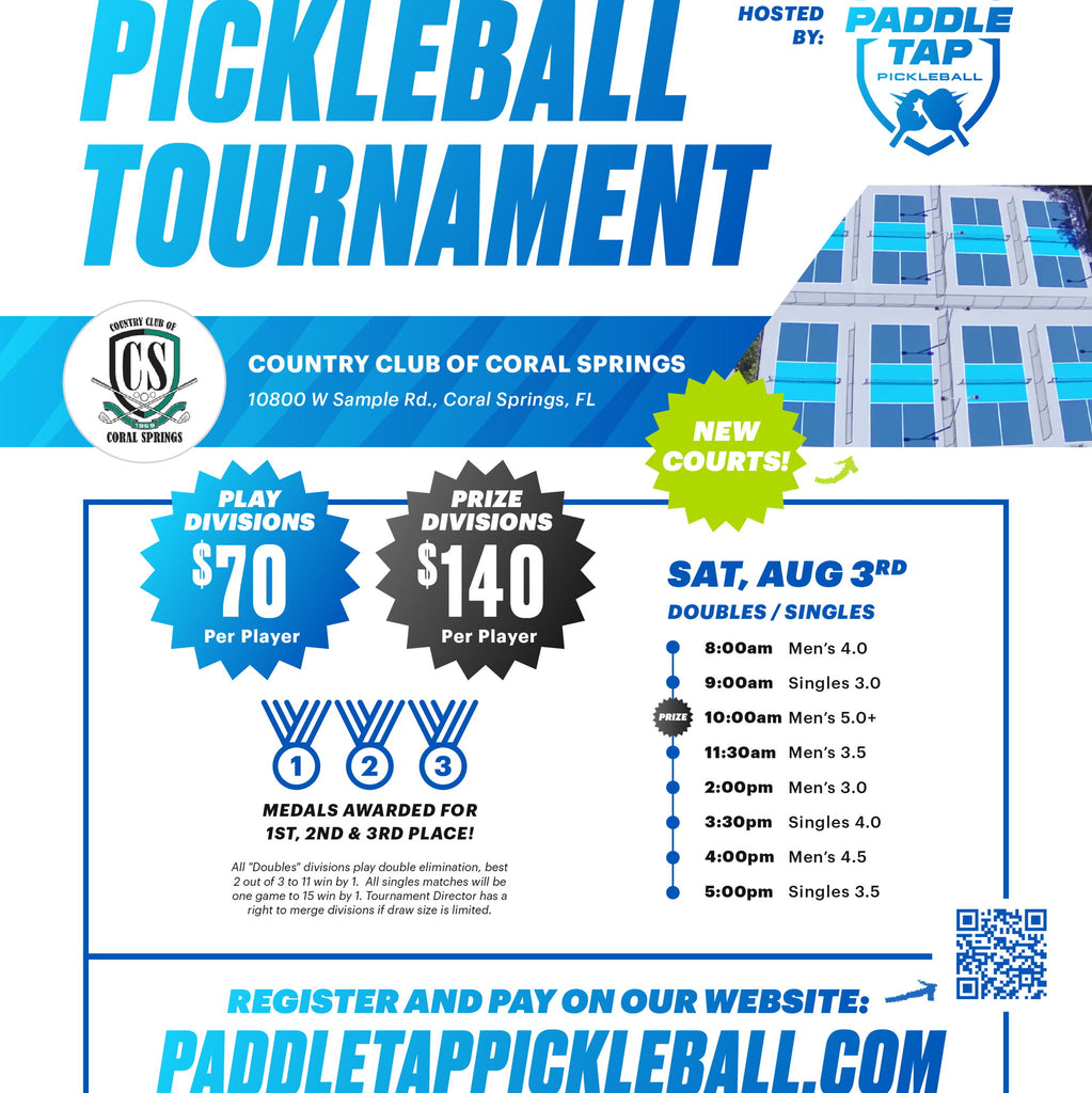 $140 entry fee per player Men's 5.0+ which has Prize Money. Hosted by Paddle Tap Pickleball, the leader in South Florida pickleball tournaments.