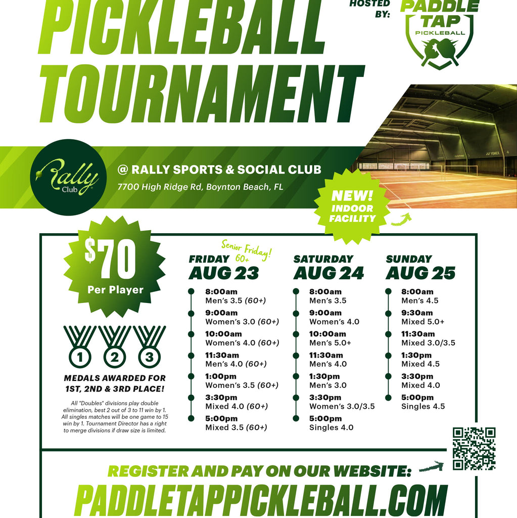 $70 entry fee per player. Divisions skill level 3.0 through 5.0 Medals Only, No refunds after 08/16/24